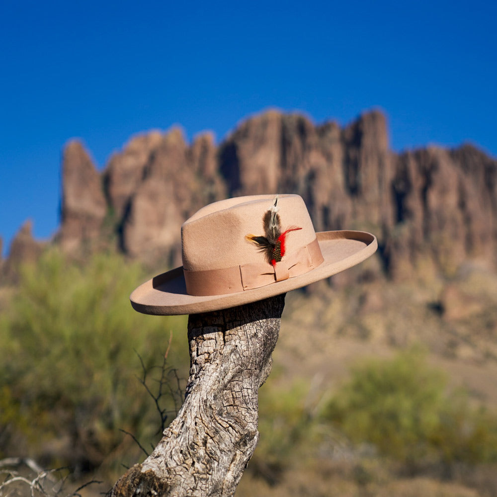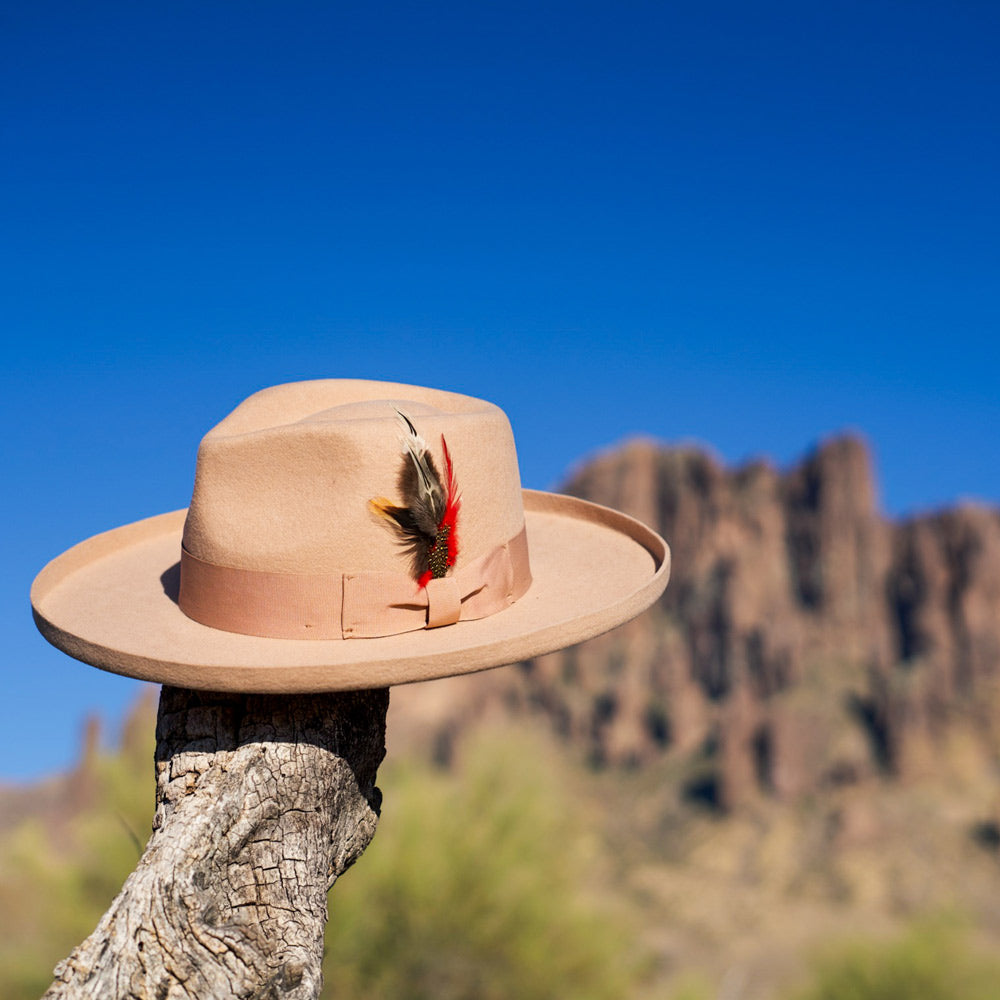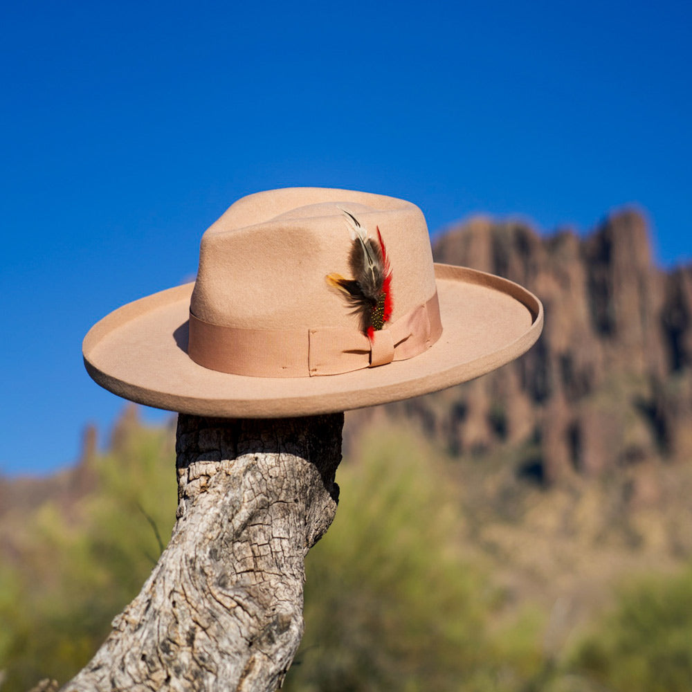 Forged in fire, the Dust & Ember is a bold, gender-neutral statement of mystery and strength. Its structured silhouette, with a sharp crown and optional burned-edge detailing, is crafted from distressed beaver felt in charcoal gray, ember red, or smoked brown. A custom metal pin or woven band adds a distinctive edge.