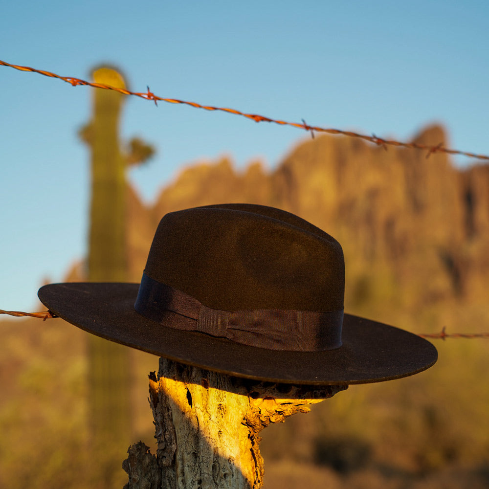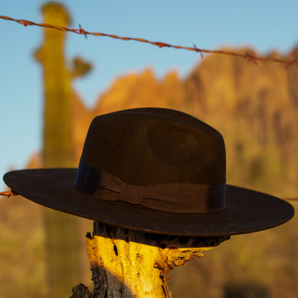 The Lone Mesa captures the untamed essence of the high desert, merging rugged charm with refined craftsmanship. Its wide-brim fedora silhouette, with a teardrop crown, offers a timeless look that transitions effortlessly from city streets to open plains. Crafted from premium wool felt or a luxurious beaver blend in sandstone, bone white, or weathered gray, it’s finished with a hand-stitched leather band for subtle sophistication. The Lone Mesa is for those who carve their own path with quiet confidence.