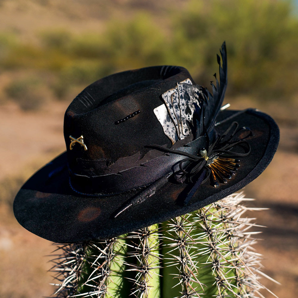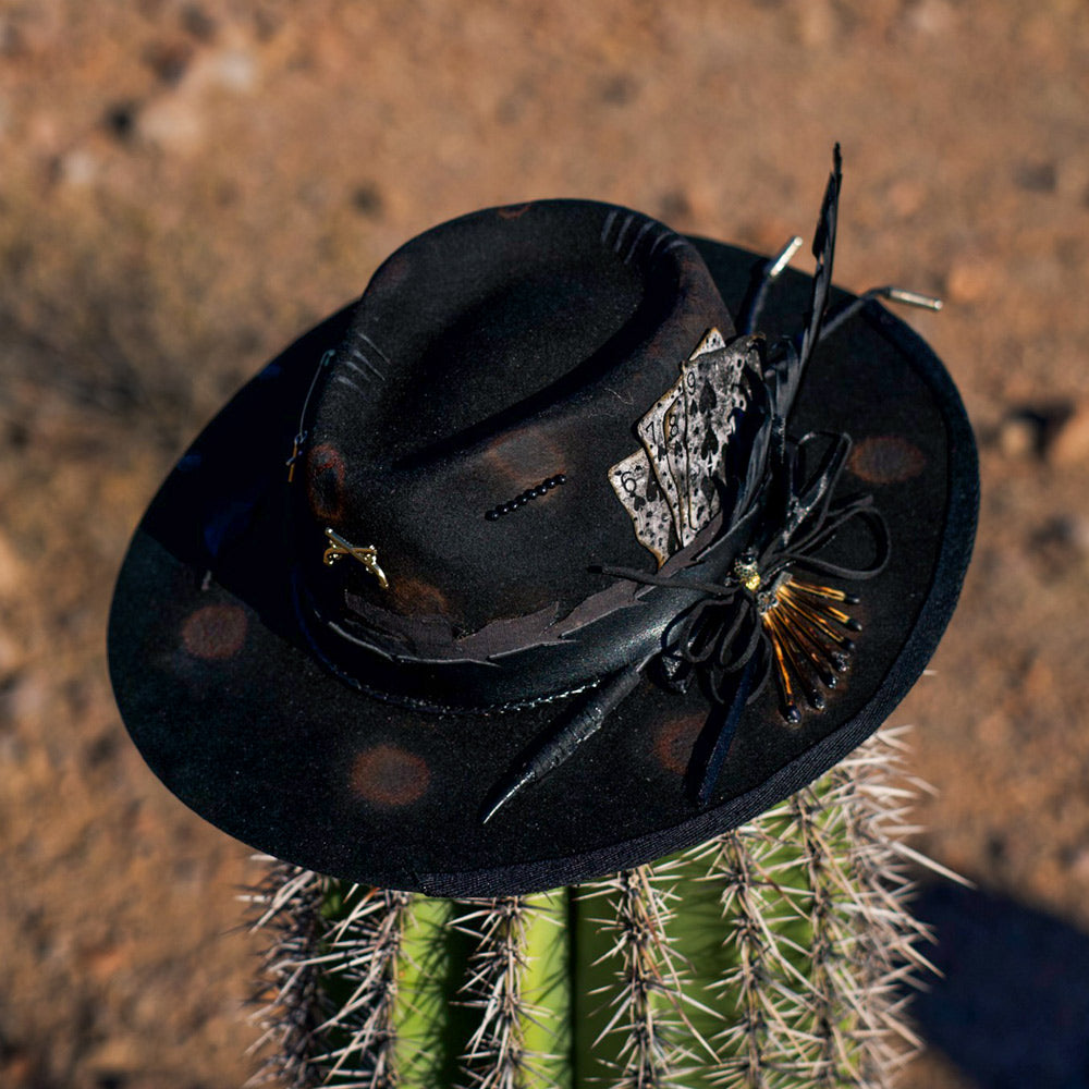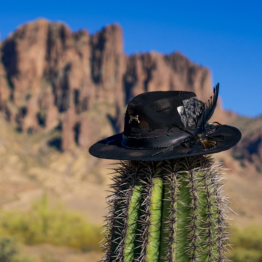 The Sable Ridge is dark elegance at its finest, with a sleek fedora silhouette and sharp brim. Crafted from smooth beaver felt in black, dark sable, or burgundy, it features a satin or leather band for a luxurious finish. Ideal for those who exude sophistication with an untamed spirit.