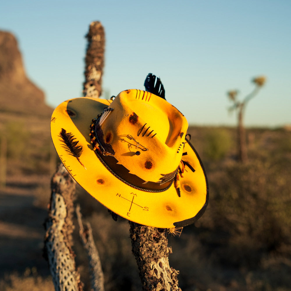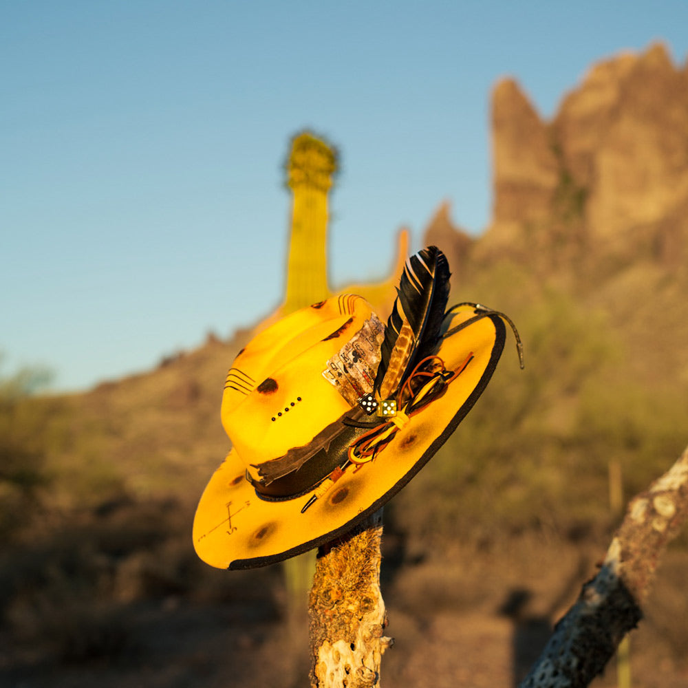 The Sundown Ridge embodies the romance of a desert sunset, with a bold Western flat-brim and structured crown that commands attention. Handcrafted from high-grade felt in burnt sienna, tobacco brown, or deep rust, it features a hand-stitched suede or braided horsehair band for a touch of rugged elegance. Perfect for those who live for the drama of twilight, fall-inspired, this hat blends heritage craftsmanship with modern swagger.